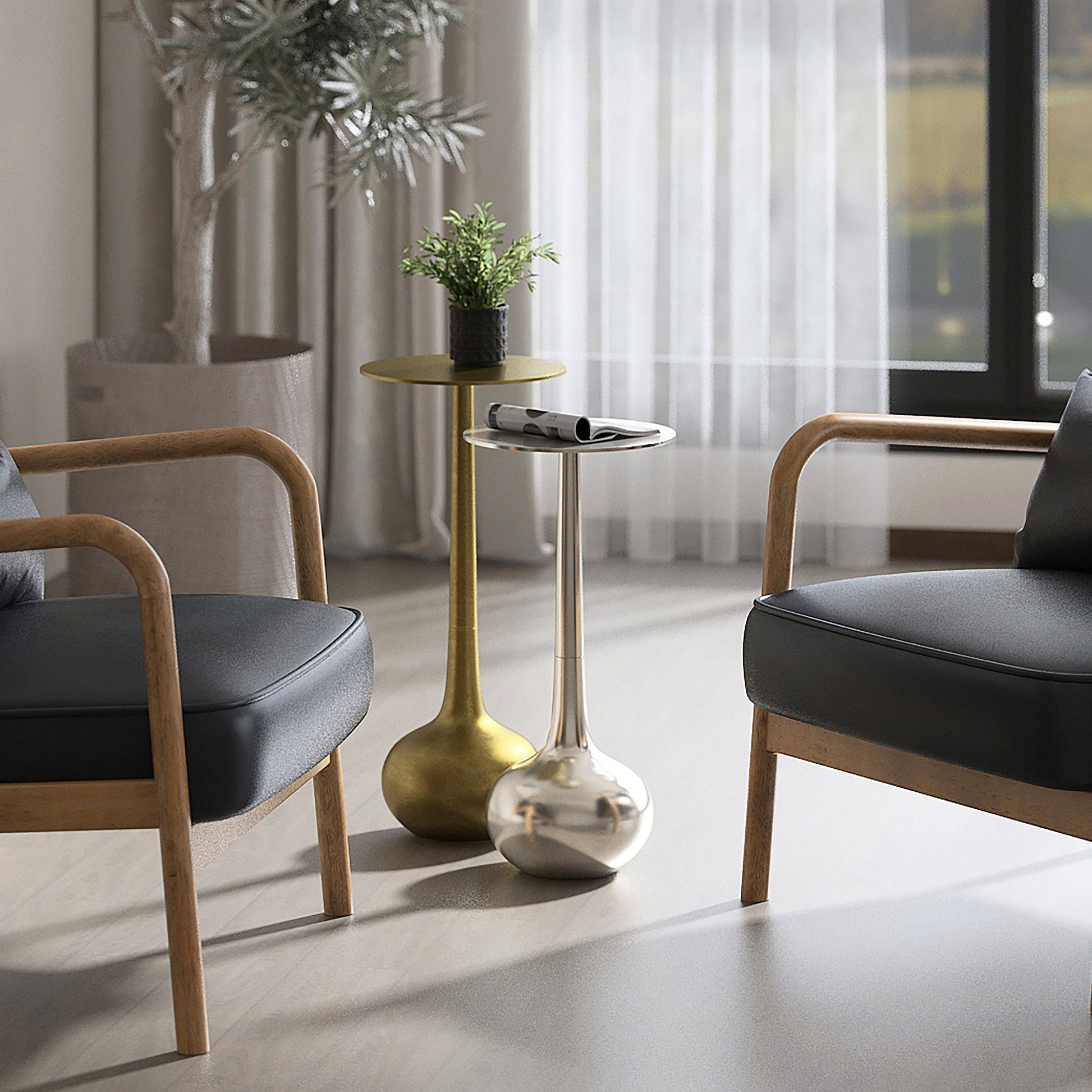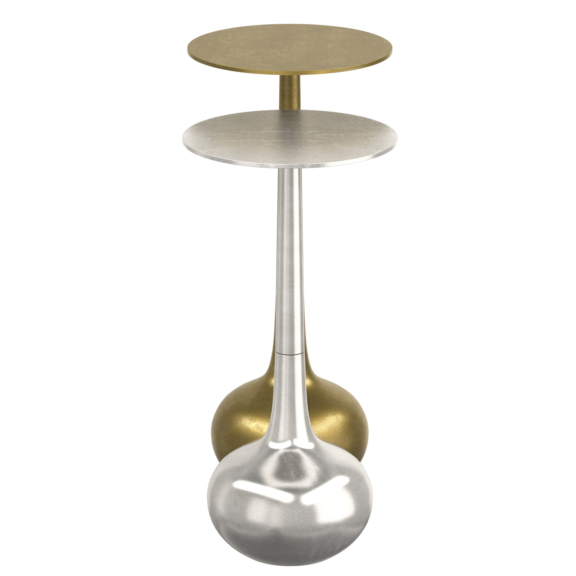 Taller table has an antique gold finish, smaller has a silver nickel finish