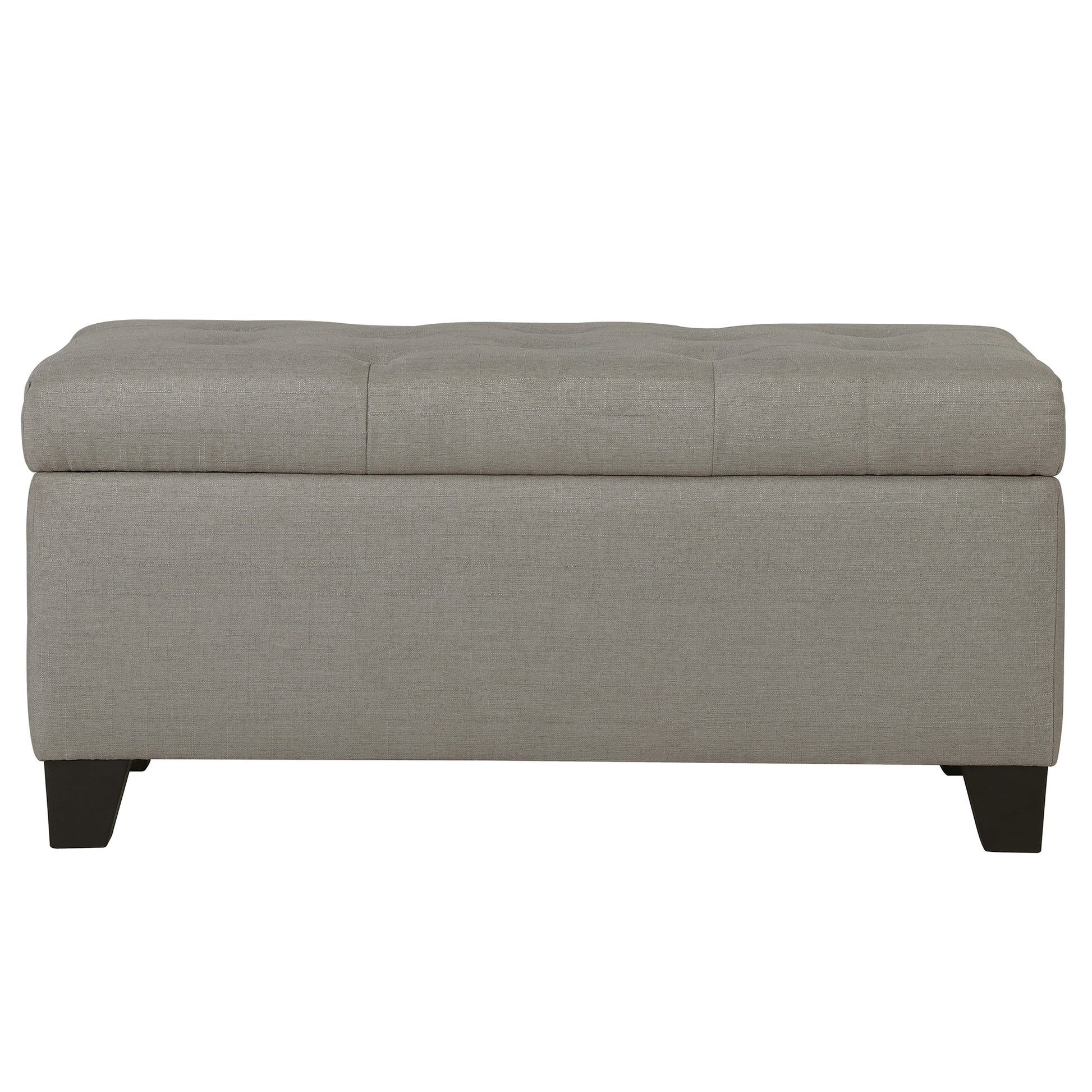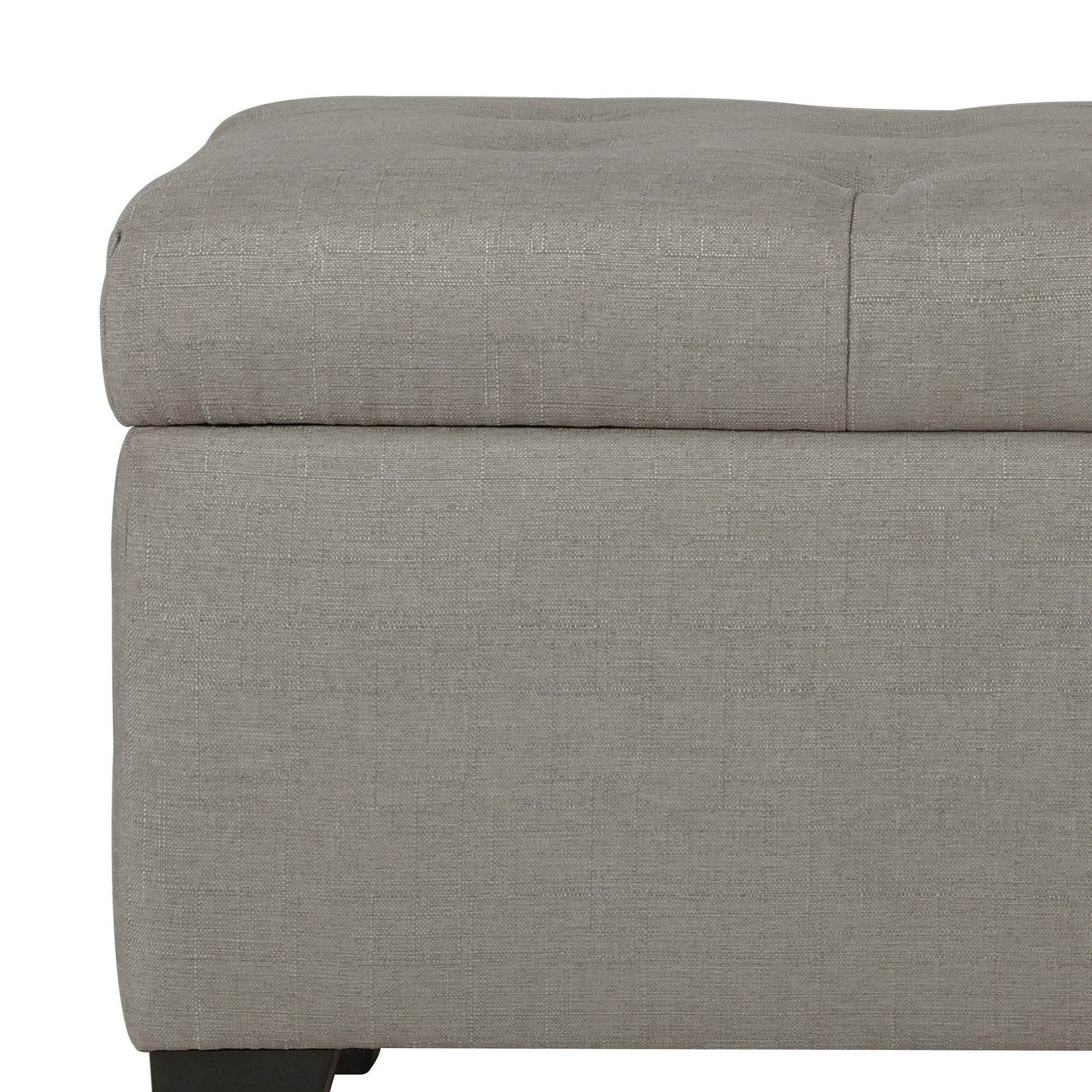 Items you keep in this ultra-deep storage ottoman may be out of sight and out of mind, but this piece can stay front and centre! A perfect add-in to any space for extra seating when needed and extra storage always available. The button-tufting design on the upholstered top is a fun design feature. Safety-stop hinges keep fingers safe by preventing any accidental slamming of the seat. Sturdy black legs provide stability and support in this versatile piece.