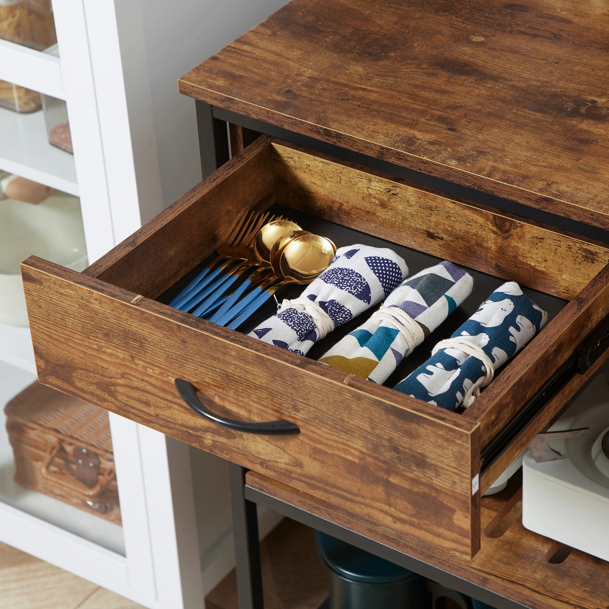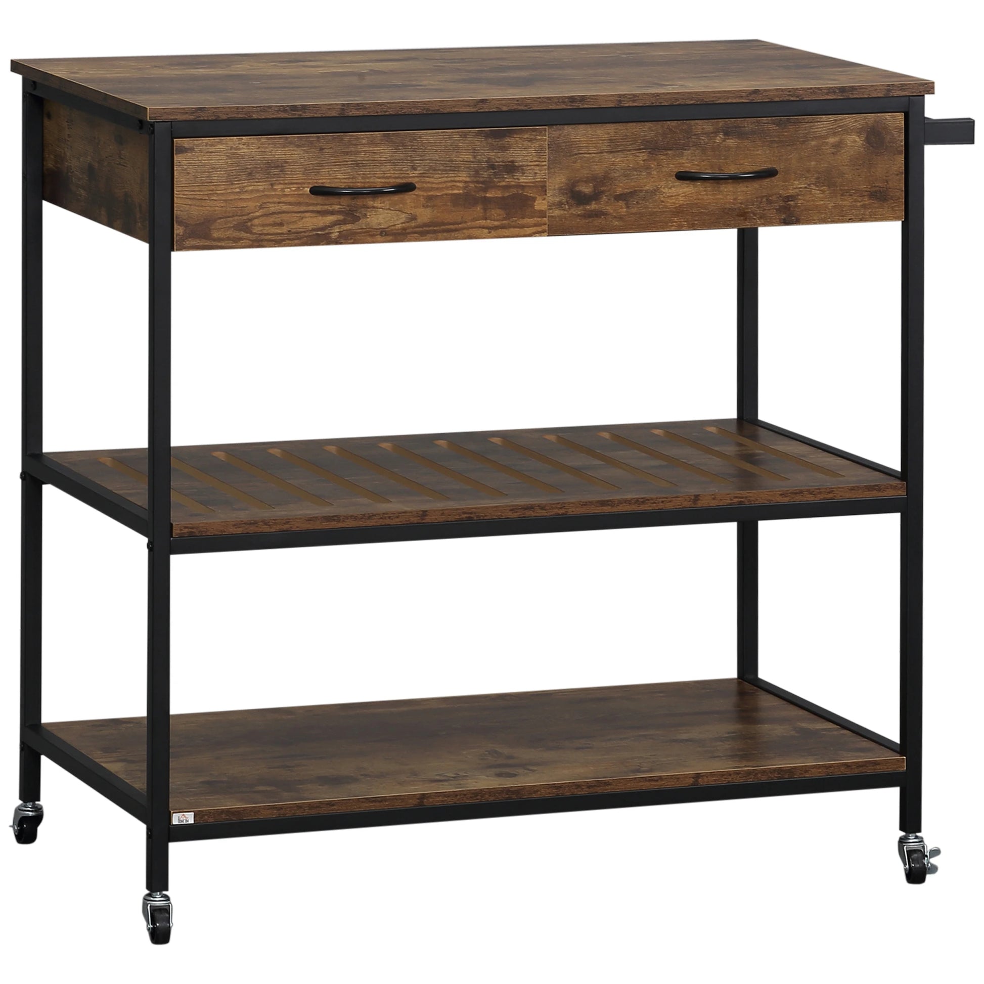 ndustrial Kitchen Island on Wheels, Rolling Serving Cart with Drawers, Storage Shelves, Towel Rack for Dining Room, Rustic Brown