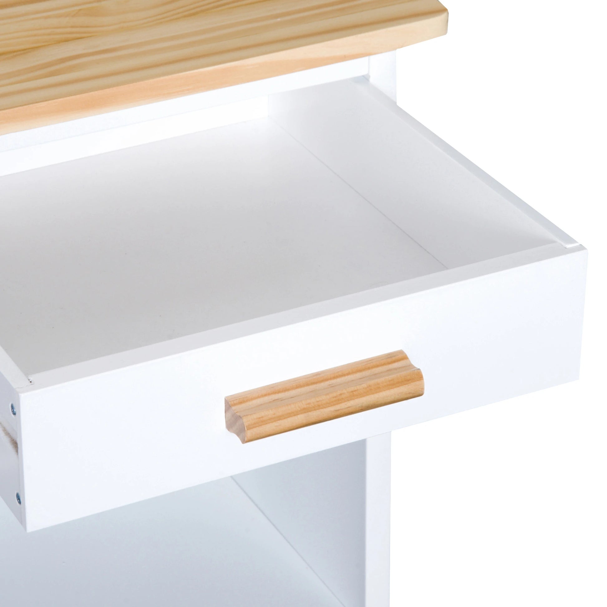 Solid pine wooden kitchen island table with white finish and bamboo cutting board, bamboo primary color panel can fit any style of your house.